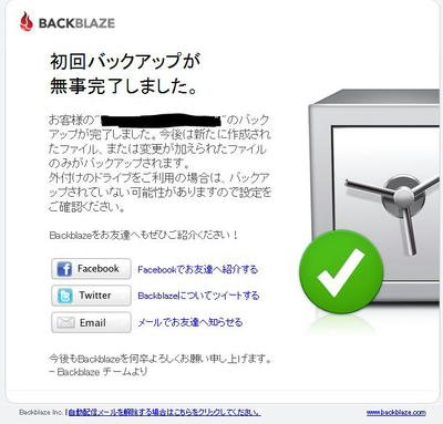 また、初回バックアップが完了すると、以下のような完了メールが通知されます。